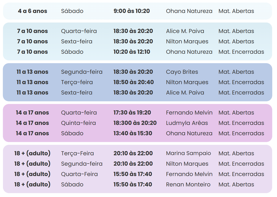 Segue as informações das turmas: idade, dia, horário e professor.